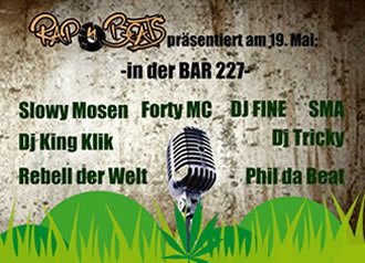 Nach der überragenden Auftaktparty Anfang Januar diesen Jahres gibt es nun endlich die Fortsetzung von Rap`n´Beats. Am 19.05.2012 um 22 Uhr wird sich Hamburgs Hip-Hop Gemeinde in der Bar 227 einfinden. Von alten Ami-Hip-Hop Beats der B-Sides bis zur deutschen Oldskool-Platte wird die Bar 227 eingenebelt von Real Hip-Hop. Hierzu gehört eine ordentliche MC-Staffel mit den dazugehörigen Plattendrehern. Die Crowd wird feiern und genießen.